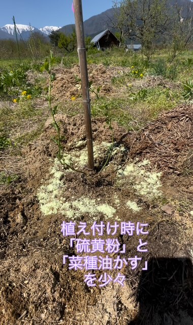 「散布」する資材として、植え付け時に、硫黄粉と油粕を使っています。