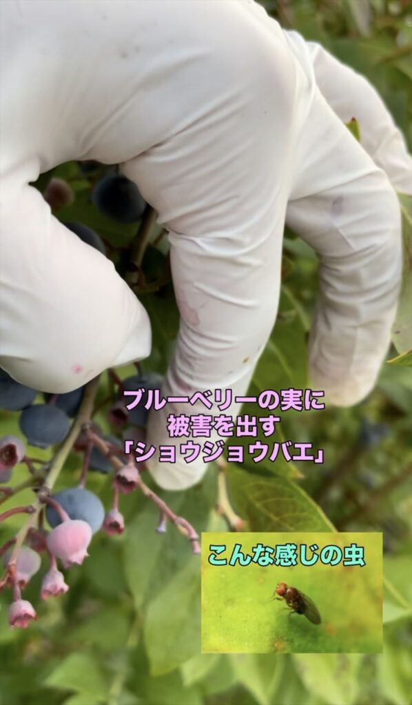 このように、ブルーベリーの森あずみのでは、こまめなチェックと、品種の選択などで、ショウジョウバエの被害を防いでいます。
