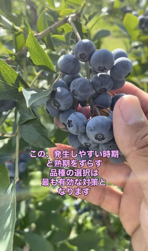 そのため、梅雨明けとなっていることが多い、8月上旬からのブルーベリーの品種をメインに栽培することも、ショウジョウバエ被害の防止となります。